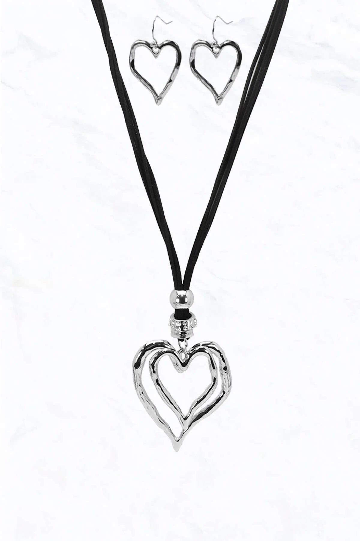 38" + 4.5"(Inch) Metal Double Heart Charm Cord Necklace & Earring Set