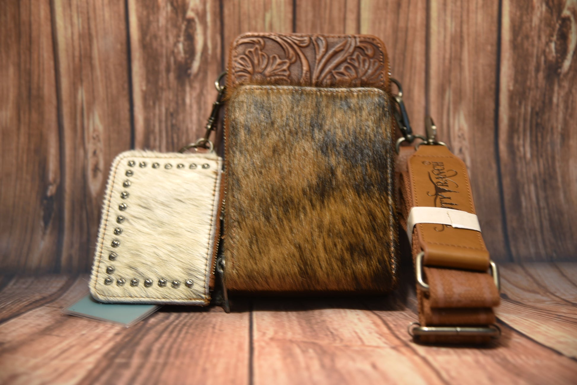 - A detachable hair-on coin purse with a key ring